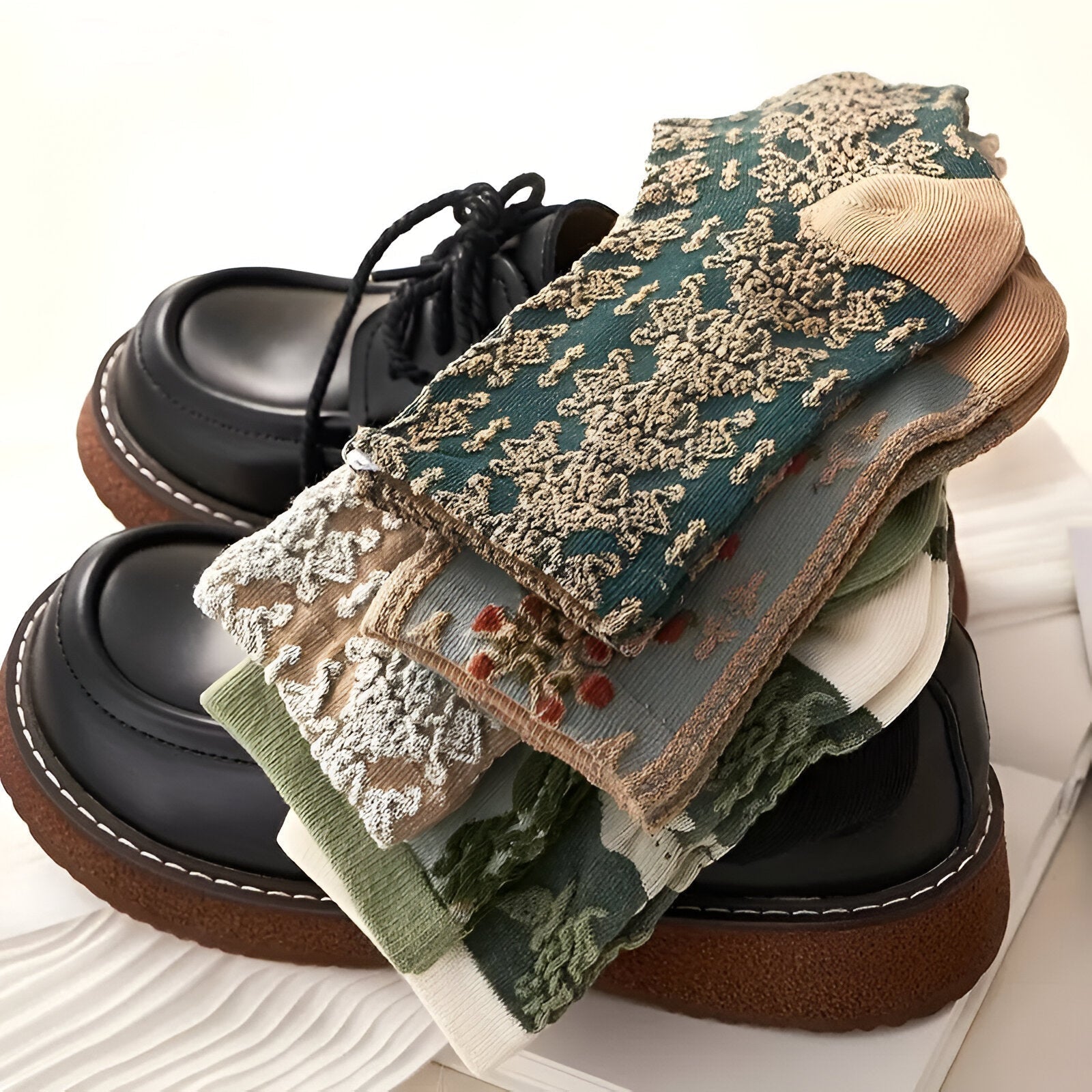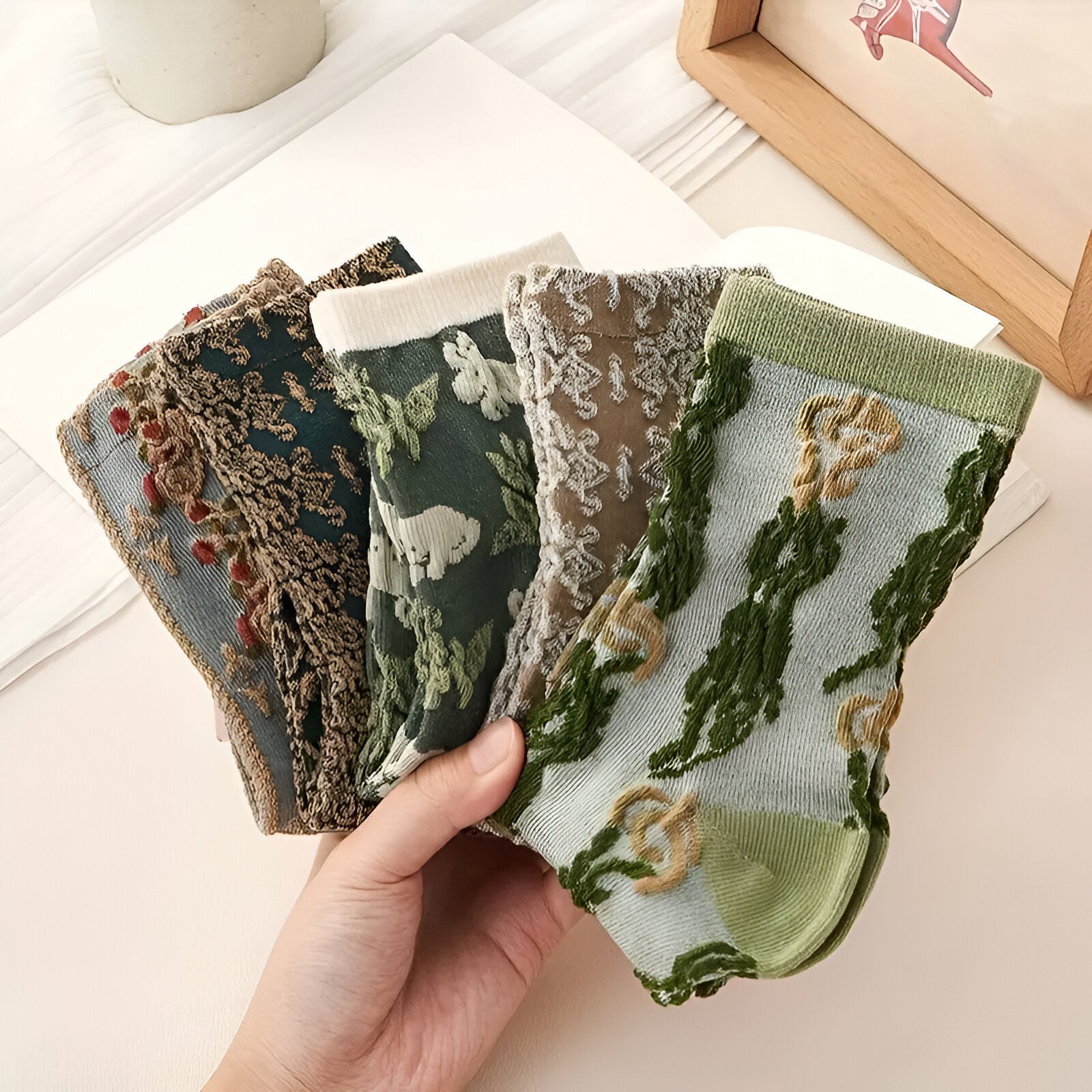 Soft combed cotton meets plush tufted embroidery in a richly textured pair that brings cozy charm to every step. Each pair is a story woven with raised floral threads and forest-inspired details that feel like walking through a painted garden.