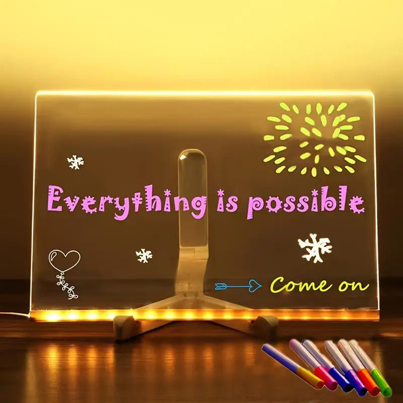 Crafted with a high-grade clear acrylic panel, this glowing display board brings your doodles and messages to life with vivid color and crisp clarity. Built-in LED edge lighting highlights every stroke from the included neon markers, creating a captivating scene day or night.